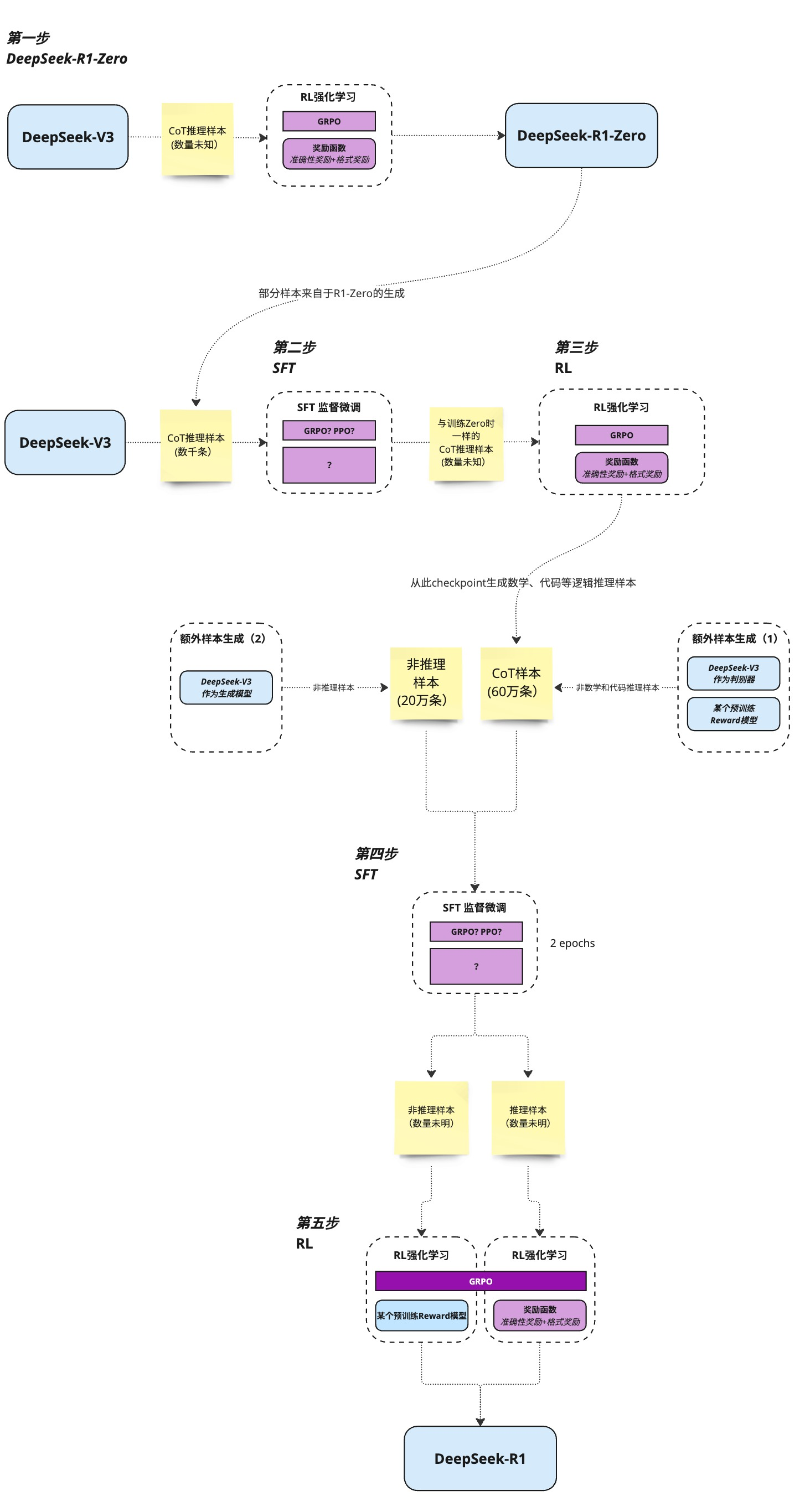 - 初始人工标注的数据也就数千条,这部分标注的成本不高。利用这部分数据初步SFT微调base model,得到一个中间过渡model;然后用这个过渡model生成R1所需的大量cot数据和non-reasoning data;R1所需的数据主要由过渡版本生成的,所以数据的成本也不高(当然过渡版本本身肯定有性能问题,所以生成的样本数据需要用规则或base model判断一下质量,只保留质量好的数据)!这可以无限“套娃”,互相增强,可以让“子子孙孙model无穷尽也”!这种方式一旦自动化,也能让model实现自我迭代、自我更新 self - evaluation!