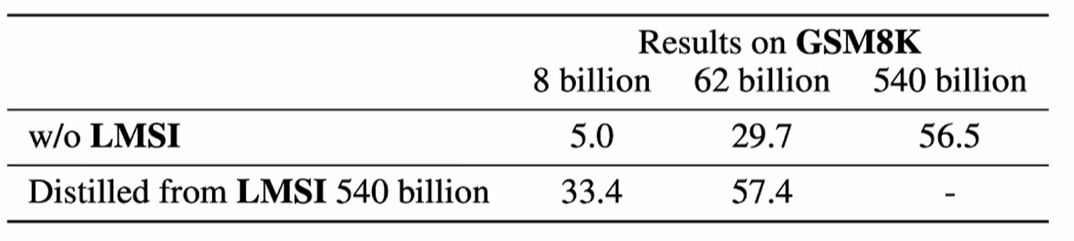llama3的论文早在deepseek-R1前就发现了这个现象:用具有COT能力的大模型distllation得到的小模型,性能比不具备COT的pre-train大模型还好!比如62B是用具备COT能力的大模型蒸馏得到的,性能比540B的pre-train模型效果还好!