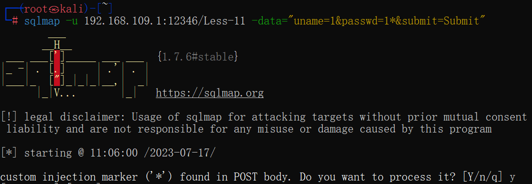 在这里如果直接写的话,sqlmap会从前到后询问我们是否检测每个参数,如果想优先指定某个则需要在参数的值后面加上“*”,比如指定passwd: