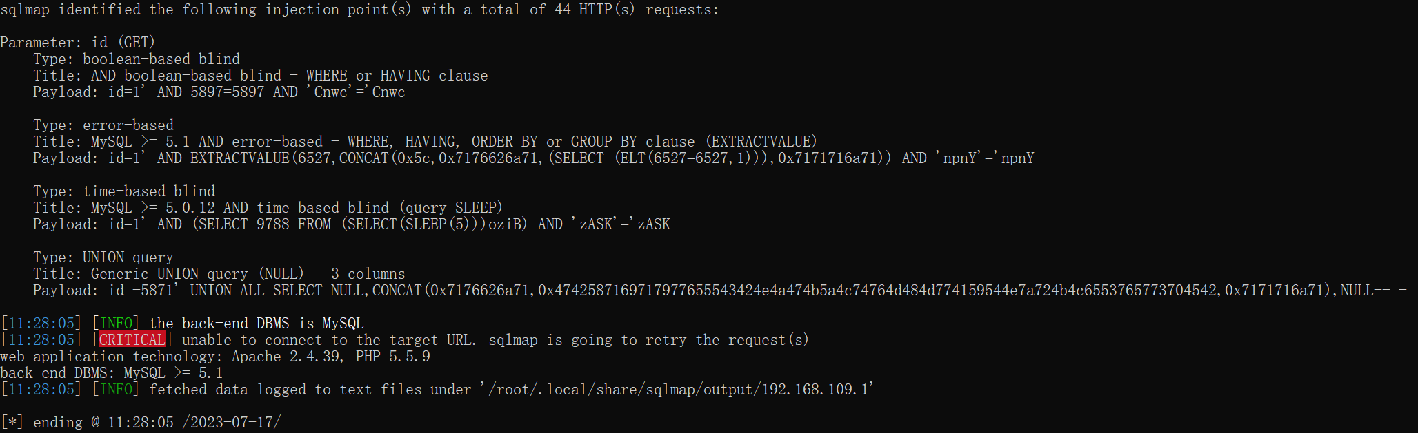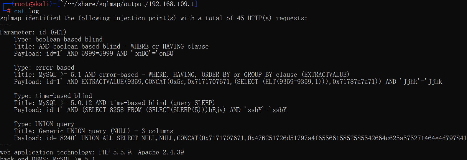 sqlmap需要一个能够传参的地方才能使用,这里的注入点是id这个参数,使用的方式是GET