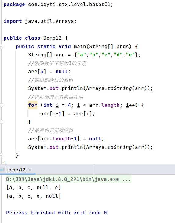 我们可以通过后面的所有成员全部向前赋值的方式来填补被删除的空缺。在数组最后赋一个“null”,这样既保证数组中没有空缺又没有改变数组的长度。
