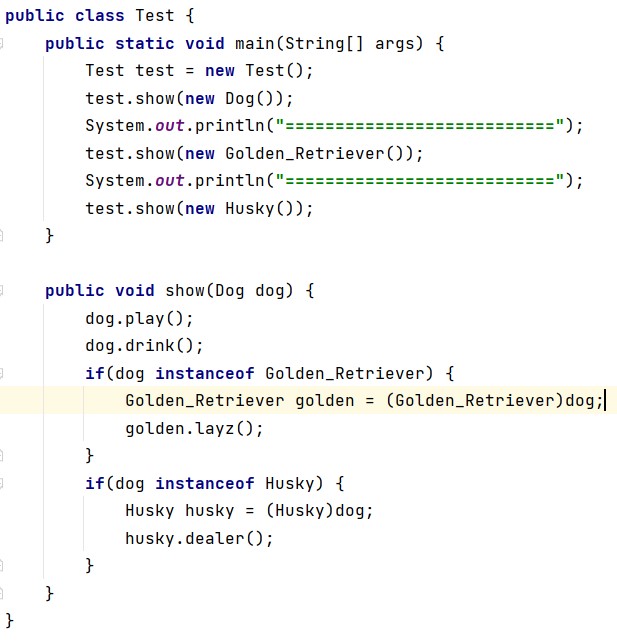 在Test类里写show方法,实现多态,子类都通过父类走子类的方法,如果子类的方法没有对父类进行重写,那么就经行向下转型,再调用子类的方法。