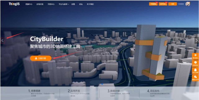 那么是如何制作这个3D城市地图呢?不要急,进入ThingJS网站首页,点击侧边栏,找到CityBuilder页,点击立即开搭,即可进入到ThingJS的CityBuilder功能页面,在这个CityBuilder页面,我们可以进行增加CityBuilder场景、修改CityBuilder场景名称,删除CItyBuilder场景操作,同时也可以对场景进行编辑修改。