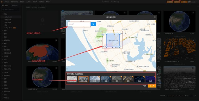 那么是如何一键城市的呢?很简单,点击新建,选择一键城市,在出现的面板中输入大致位置,然后拖动选择框来确认位置(目前来说,国内部分数据不完整,如有需求可以自行购买完整数据上传至CityBuilder中),最后选择一个模板,点击下一步,新出来的面板中可以设置地图场景的名称,设置完毕后即可进入到CityBuilder的编辑页面,在这个页面即可展示我们选择区域的数据,同时也可以使用CityBuilder相关功能,比如对建筑面中的建筑进行单独或者整体替换,最后附上一张对建筑整体替换模型功能图片,大家有兴趣看可以进入ThingJS的CityBuilder中尝试使用哟!