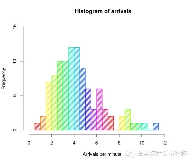 上图,最关键的就是横轴了,柱高,即,对于横轴上每一个点,发生的频次。图中横轴为4处,次数最多,大约12次;依次类推,横坐标为10处,发生1次……