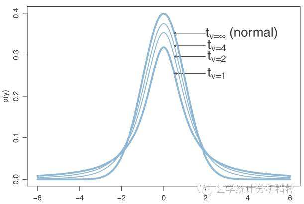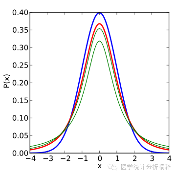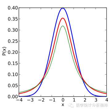 研究样本量的估计量更小。熟悉样本量计算的朋友也知道,标准差是样本量计算的一个重要参数。上例中,我们t分布的标准差只是正态分布的四分之一,那么我们计算所需的样本量也会极大的减少(只需原来的16分之一),极大地降低研究经费和工作量!(关注“医学统计分析精粹”,回复关键词“样本量”,可以看到很handy的样本量计算工具哦!)