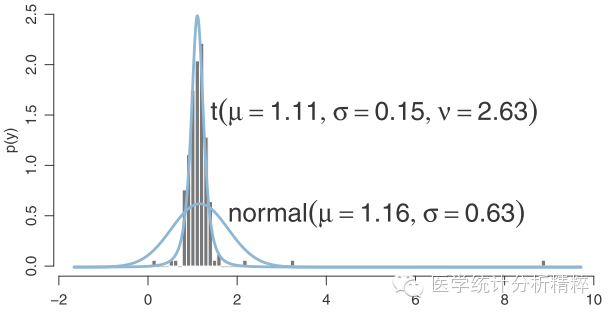 PS:上述两幅图中的t分布曲线并不是频率学派应用t分布的常规套路(更像是贝叶斯学派的用法)。细心者可以发现,我们使用的t分布的自由度明显低于n - 1的自由度计算方法。这里的自由度是根据最大似然法估计出来的,用以更恰当地拟合数据的分布。虽然这与我们平时的用法不同,但小编觉得,这一点点不同不仅无伤大雅,反而更有利于大家深入理解t分布的特征——温良宽厚。
