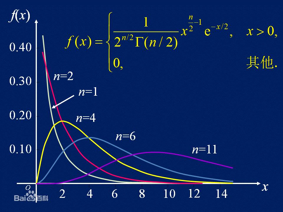 若n个相互独立的随机变量ξ₁、ξ₂、……、ξn ,均服从标准正态分布(也称独立同分布于标准正态分布),则这n个服从标准正态分布的随机变量的平方和