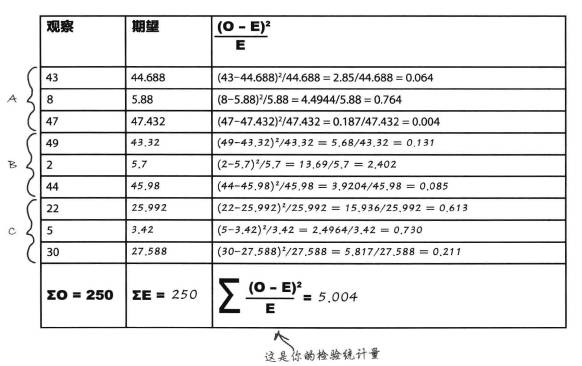 2、利用卡方公式计算检验统计量:(O代表观察期望,E代表期望频数)