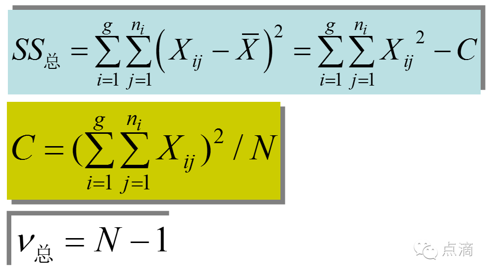 1,总变异:全部测量值各不相同,这种变异称为总变异。总变异的大小可以用均差平方和SS来表示,即各测量值Xij与总平均数差值的平方和,SS总,反映那个了所有测量值之间总的变异程度。