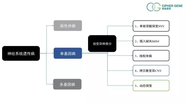 神经系统类的单基因病变异种类主要有5大种,包括单核苷酸突变SNV、插入缺失InDel、线粒体基因突变、拷贝数变异CNV和动态突变。