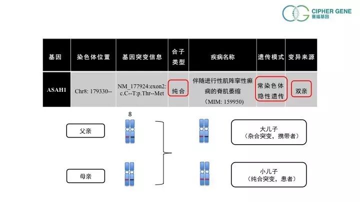 如我们分析的这一个实例,检出的与患者表型相符的致病基因为ASAH1,对应的疾病是伴随进行性肌阵挛性癫痫的脊肌萎缩,属于常染色体隐性遗传。该患者的父母是近亲婚配,患者检出ASAH1基因的纯合突变位点,而父母都是致病基因杂合突变的携带者,哥哥也是杂合突变的携带者。