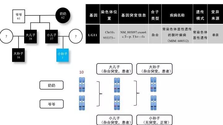 全外显测序和一代验证均证实:奶奶、大儿子、小儿子、大孙子的LGI1基因均发生了杂合突变,小孙子该基因未见突变信息。那么如果大孙子以后结婚生育的话,若伴侣该基因正常,则生育患病孩子的概率是50%。