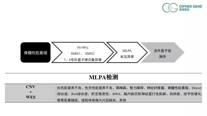 但是适合CNV检测的疾病进行CNV检测也并不能保证100%的检出率。比如我们接到的这样一个病例,患者的临床表型和SMA很相符,而SMA患者中约 95-98%是由 SMN1 基因纯合缺失引起,其余由 SMN1 基因杂合缺失、转换及点突变导致,而 SMN2 基因拷贝数在修饰 SMA 表型方面起一定的作用。SMA 的基因诊断一般通过检测 SMN1 基因外显子 7 的拷贝数来完成。 我们在使用MLPA检测之后,结果是阴性。而在对该加下进行全外显测序之后,则发现了致病的基因单核苷酸变异。所以对于临床患者来说,如果想将阳性检出率提高,有时我们会推荐WES和CNV检测同时进行。表中列出了部分神经系统疾病适合选择该种检测手段的疾病列表,请各位老师参考。