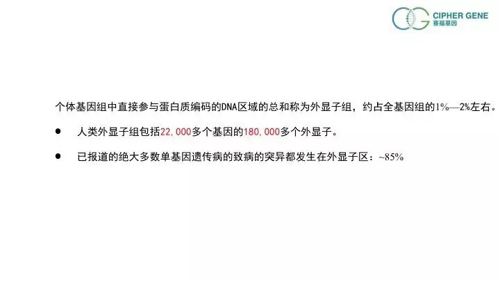 那么外显子组测序为什么可以应用于遗传病的检测呢?是因为现已报道的绝大多数单基因遗传病的致病的突异约85%都发生在基因的外显子区。