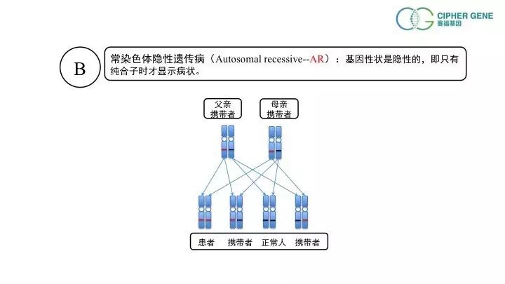 常染色体隐性遗传病(Autosomal recessive--AR):基因性状是隐性的,即只有纯合子时才显示病状。如果父母双方都是病理性基因杂合突变携带者,则下一代1/4发病、2/4为携带者、1/4为正常。如果父母一方为病理性基因杂合突变携带者,一方为正常人,则下一代外表上均无病,但1/2为携带者,1/2为正常人。常染色体隐性遗传病的特点为:病儿双亲都无病,但都是致病基因携带者;病者子女中一般不发病,所以看不到连续传递,多数为散发或隔代遗传;在近亲婚配时,子代发病的风险增高。