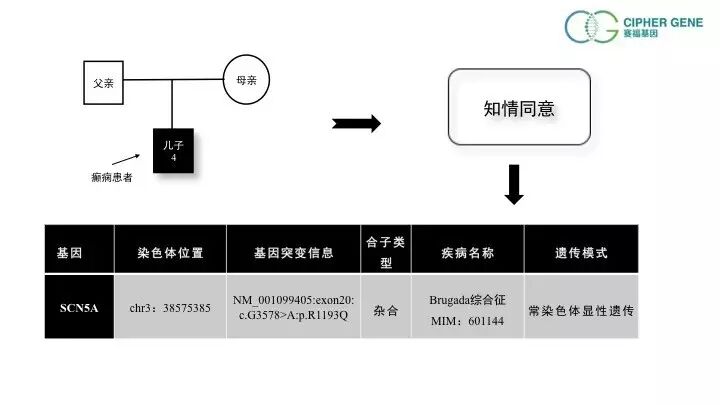 在我们所做的一个癫痫患者的例子中,我们除了找到和该患者疾病表型对应的癫痫致病基因之外,我们也检测到了其中的一个补充医学发现的致病突变:SCN5A,对应的疾病是Brugada 综合征,这是一种离子通道基因异常所致的原发性心电疾病,属心源性猝死的高危人群。Brugada综合征是导致青壮年猝死的主要原因。一旦诊断成立,立即植入ICD(及早置入心脏除颤器(ICD))是防止患者猝死的唯一有效的办法。所以对于该患者来说,即使现在没有患该疾病,在其以后的生活当中,也应该对该疾病引起足够的重视。