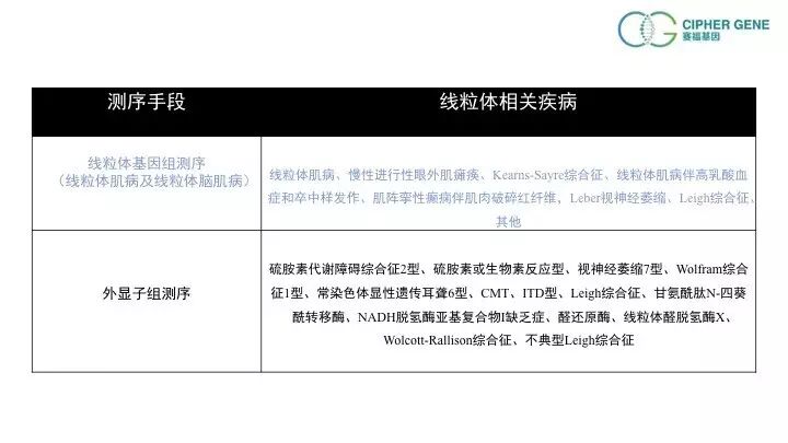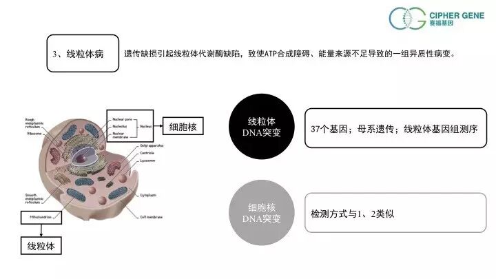 线粒体病主要是由于遗传缺损引起线粒体代谢酶缺陷,致使ATP合成障碍、能量来源不足导致的一组异质性病变。其按照突变来源分可以分成线粒体DNA突变导致,以及由核基因突变导致(WES可检出)。对于线粒体DNA突变导致的疾病具有母系遗传的特征,其可以通过对线粒体基因组进行基因组测序或位点测序进行确定。