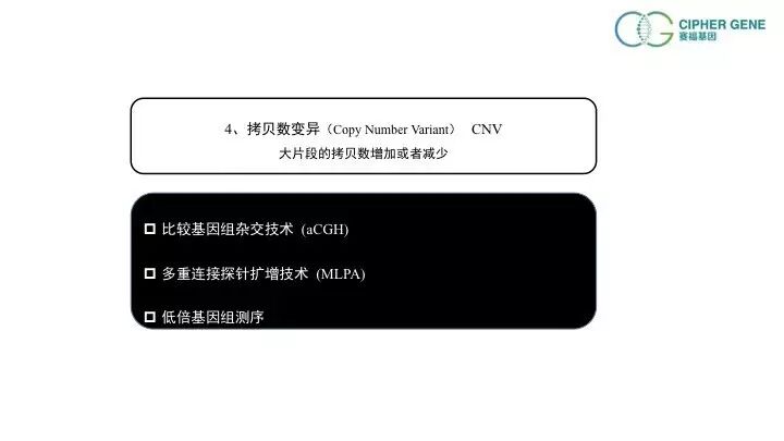 CNV检测现在主要的是以下三种技术:比较基因组杂交技术 (aCGH)、SNP-array、多重连接探针扩增技术 (MLPA)和低倍基因组测序。如果患者存在畸形,精神发育迟滞,多系统疾病等,可以考虑先进行CNV检测。
