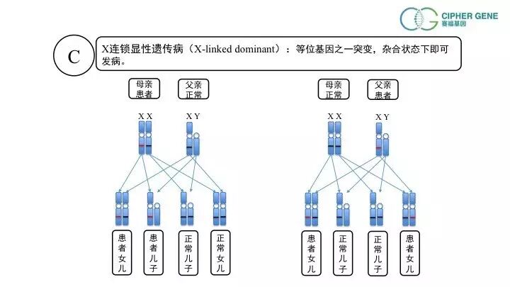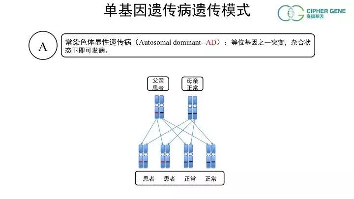 常染色体显性遗传病(Autosomal dominant--AD):等位基因之一突变,杂合状态下即可发病。人体中有23对,46条染色体。在形成生殖细胞的过程中,成对的染色体分开,每对染色体中的一条进入精子或卵细胞中,通过受精作用形成的受精卵既含有卵细胞的染色体,又含有精子的染色体,因此人的受精卵中的每一对染色体都是一条来自父方,一条来自母方。