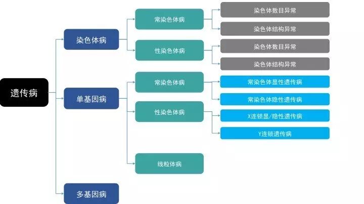 遗传病按照突变类型和遗传方式分,主要分为3大类:染色体病、单基因病、多基因病。第一大类:染色体病,又可以根据常染色体和性染色体分成染色体数目异常(18三体综合征、Turner综合征等)和染色体结构异常(猫叫综合征)。第二大类,单基因病,也是临床中基因检测技术应用最多的一个领域。其按孟德尔遗传方式分类,可以分成常染色体显性遗传病、常染色体隐性遗传病、X连锁显性遗传病、X连锁隐性遗传病和Y连锁遗传病。另一单基因遗传病的大类是线粒体病,其遗传方式不符合孟德尔遗传。第三大类:多基因病,有家族聚集现象,但系谱分析又不符合一般的常染色体显、隐性或性连锁的遗传方式,即同胞中的患病率远低于1/2或1/4,大约只有1%-10%。同时,发病还受到环境因素的重要影响。这些有一定遗传基础的复杂疾病称为多基因遗传病,又称复杂疾病。