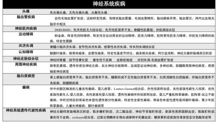 那么我们现在看一下神经系统都有哪些疾病适合进行全外显子组测序呢?