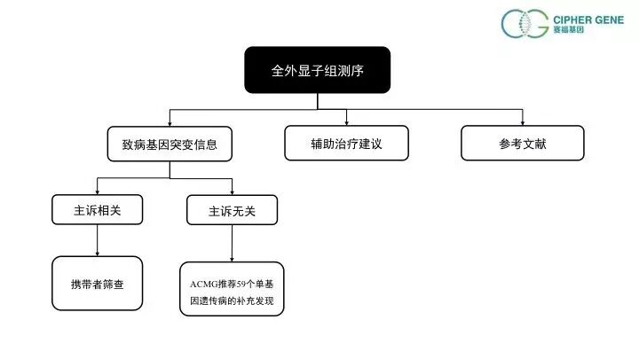 我们的报告当中,除包括与患者表型相关的检出的致病基因突变之外,还会根据现有的参考文献将与该基因对应的相应的治疗建议也会列在报告当中。而且除和患者主诉相关的致病基因报告之外,在征得患者的知情同意之后,我们还会参考美国医学遗传学会(ACMG)推荐的59个单基因遗传病的相关基因中发现的致病或疑似致病变异同时进行报告(此类遗传疾病很可能与患者目前临床表现及诊断无关,但均涉及可以进行早期干预的严重疾病)。