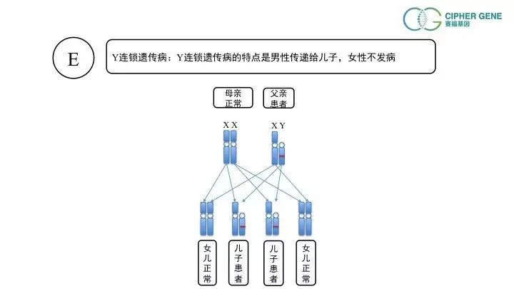 致病基因位于Y染色体上,并随着Y染色体而传递,故只有男性才出现症状。这类致病基因只由父亲传给儿子,再由儿子传给孙子,女性是不会出现相应的遗传性状或遗传病,这种遗传方式称为Y连锁遗传(Y-linked inheritance)