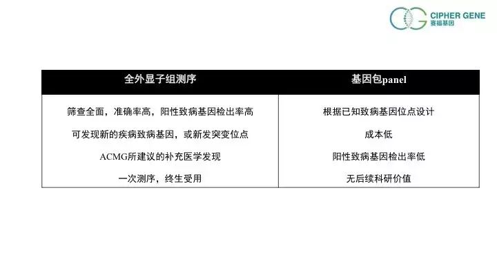 全外显子组测序相比于基因panel具有哪些优势呢?主要包括以下几个方面:1、由于WES测序的范围很全,所以相比于panel具有筛查全面,准确率高,阳性致病基因检出率高的优点。2、当测序的样本量足够大的情况下,我们可以发现新的疾病相关的致病基因。而对于单例患者样本或者是家系样本来说,发现新的新发突变位点则是有可能实现的。3、随着疾病基因数据库的不断更新,若现在检测结果为阴性的患者WES数据,使用相同的数据可以再一次进行分析并最终发现疾病分子层面的相关信息。实现一次测序,终生受用的目的。而基因panel由于其捕获范围有限,所以其成本较低,临床售价也相对的会比WES便宜。但是其的阳性检出率肯定是要比WES低的。而且这批数据也只是当时有效,若结果为阴性,但还是怀疑是基因突变导致的疾病患者,则只能选择再次测序了。