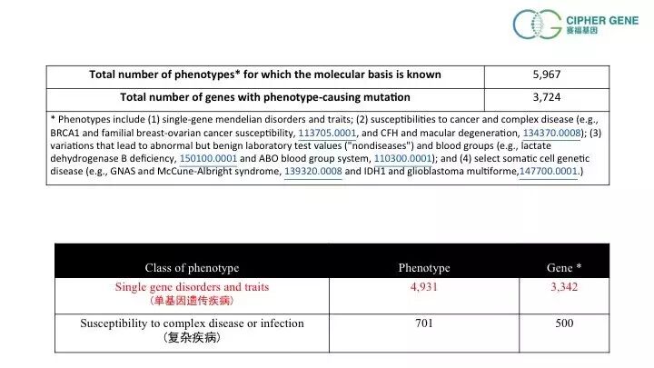 据OMIM数据库记载,截至到2017年4月15号,已明确致病基因的单基因疾病种类有4931种,3342个已知的致病基因。单基因遗传病单个发病率低,但单基因病种类极多,所以总体发病率高,且具有先天性、致死致残性的特点。