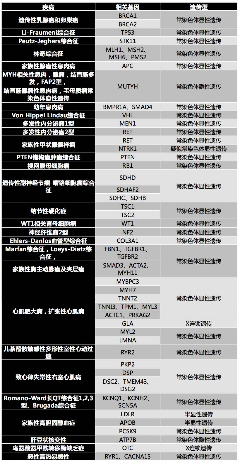 表中为所列的59个致病基因和其对应的疾病及遗传方式。