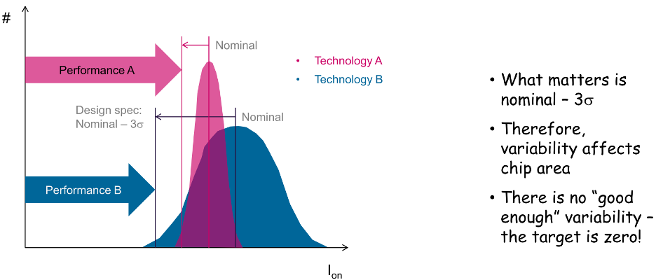 两种性能方案:A:低均值,小方差;B:高均值,大方差。GAA设计可能更倾向于前者,相对而言工艺角比均值更重要。