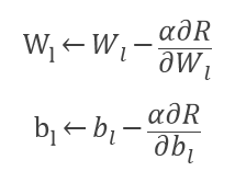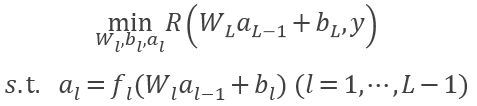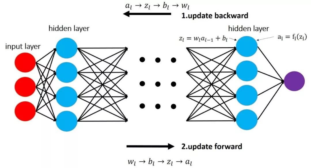 其中 W_l 和 b_l 是第 l 层的权重和截距, f_l (∙) 和 R(∙) 分别是激活函数和损失函数, L 是层数。经典的反向传播算法分前向传送梯度和后向更新参数两部分:每层的梯度按照链式法则向前传输,然后根据损失函数反向参数更新如下: