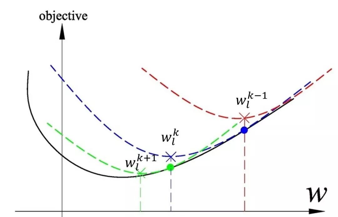 对于求解 dlADMM 产生的子问题,大部分都需要耗时的矩阵求逆操作。为此,作者使用了二次近似的技术,如图 3 所示。在每一次迭代的时候对目标函数做二次近似函数展开,由于变量的二次项是一个常数,因此不需要求解逆矩阵,从而提高了算法的运行效率。