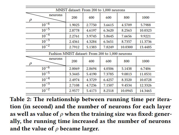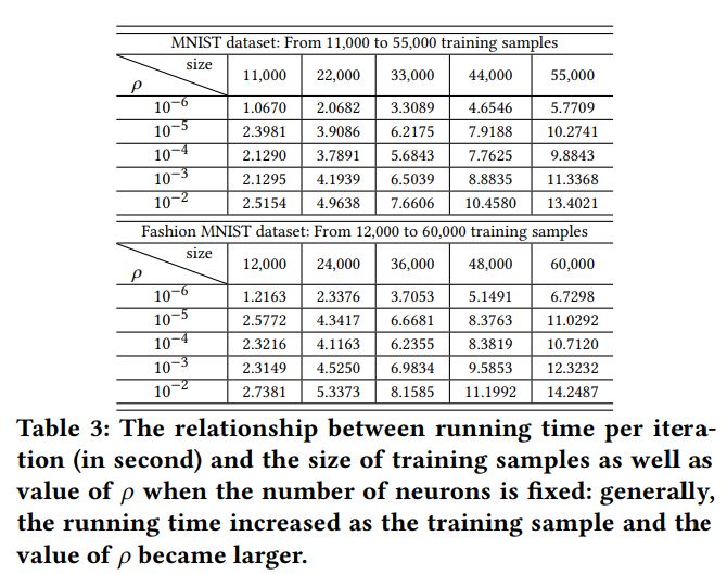 如 table 2 和 table 3 所示,当数据集数量, 神经元个数和ρ的值越大的时候, dlADMM 的运行时间越长。具体来说, 运行时间和神经元个数和数据集数量成线性关系。这个结果体现了 dlADMM 强大的可扩展性 ( scalability)。
