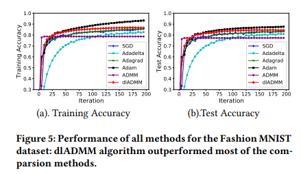 Figure 4 和 Figure 5 展示了所有算法在 MNIST 和 Fashion MNIST 的训练集和测试集的正确率,可以看到开始的时候 dlADMM 上升最快,并且在二十次迭代之内迅速达到非常高的精度并且击败所有算法。在 80 次迭代之后虽被 ADAM 反超,但是仍然优于其他算法。文中提出的改进版 dlADMM 显著提高了 ADMM 的表现,使之充分发挥 ADMM 在迭代初期进展迅速的优点,同时在后期保证较高收敛率。