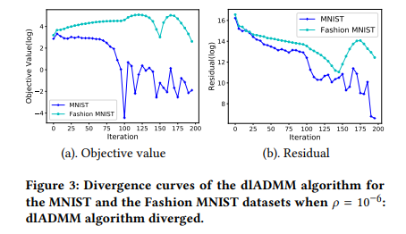 作者画出了当ρ=1 和 ρ=〖10〗^(-6) 的收敛曲线,验证了当 ρ 足够大的时候,dlADMM 是收敛的(Figure 2),反之,dlADMM 不停地振荡(Figure 3)。