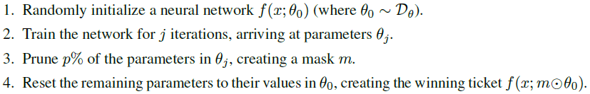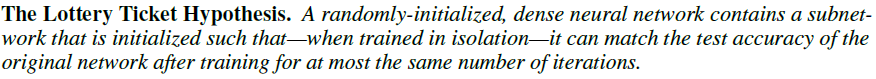 "The Lottery Ticket Hypothesis Finding Sparse, Trainable Neural Networks" 这篇文章提出了Lottery Ticket Hypothesis,认为较复杂的深度神经网络存在一个比较优化的稀疏子网络结构(称之为winning tickets),可应用于模型压缩。相比于原网络,稀疏子网络的参数量与复杂度要低许多,但推理精度基本相当。Lottery Ticket Hypothesis描述如下: