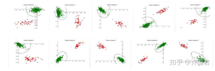 从实验上看,改胶囊投影网络可以很好地将不同语义概念的样本,在不同的子空间中按投影胶囊的模长把正负样本分开(如下图在CIFAR10数据集上的结果)。