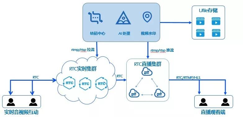 URTC利用RTC实时集群、RTC直播集群,实现音视频连麦互动可以同时推送万人直播,具体原理如下。
