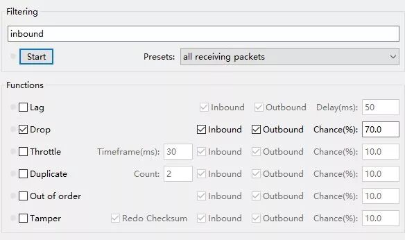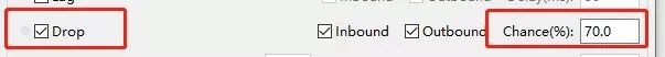 设置丢包:确认drop选项被选中,一遍开启丢包功能,后面设置丢包为70%(取值 0.0 – 100.0)