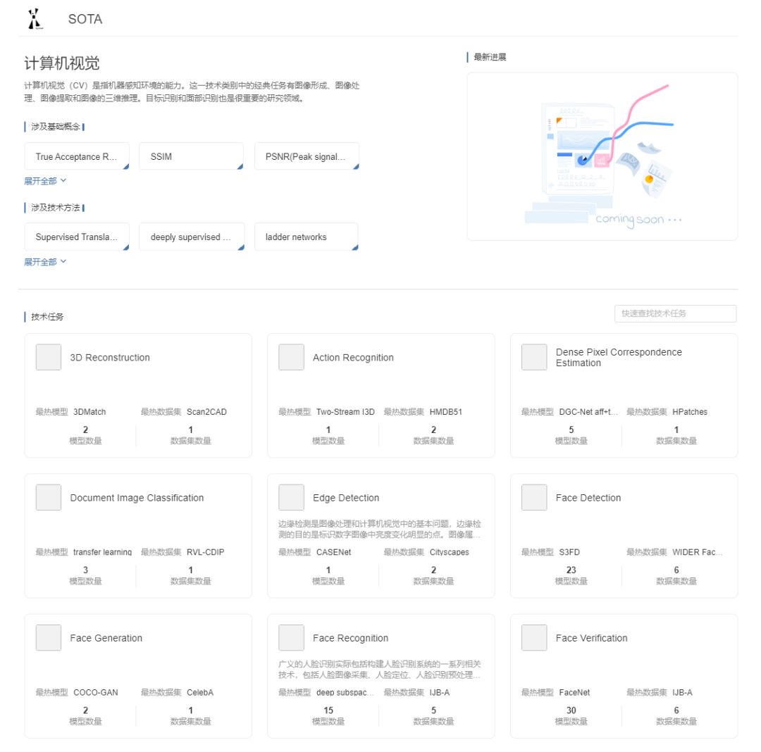 而在这一页的下方,「SOTA模型」提供了这一领域所有涉及到的任务。如边缘检测、人脸识别等。
