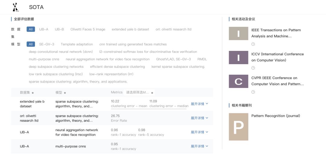 这时候,你就可以知道是否有自己需要了解的机器学习任务了。你可以点开其中的任务查看。对于一些非常火热或成熟的研究领域,「SOTA模型」还提供了相关的活动、会议和期刊。