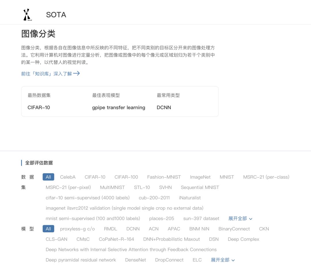 当然,你可能是一位刚刚入门机器学习的初学者,对于机器学习中的各项任务不太清楚。这时候,「SOTA模型」会是你很好的入门学习伙伴。如下图所示,「SOTA模型」首页会提供各个机器学习子领域的入口。