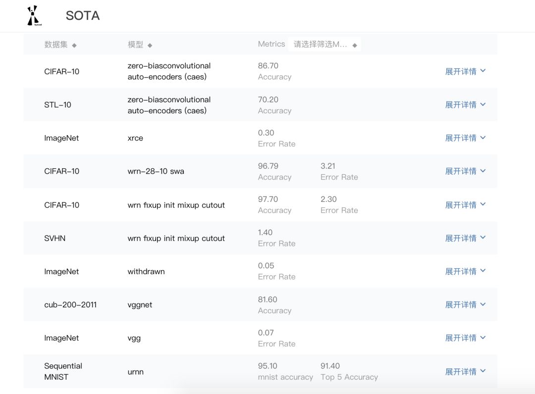 这样一来,「SOTA模型」如同一个强大的论文搜索引擎,为你直接寻找机器学习中各种各样的 SOTA 研究。它不仅仅会告诉你是什么研究,还会提供研究使用的数据集、模型、取得的 SOTA 指标数值,以及什么时候取得的 SOTA 结果。