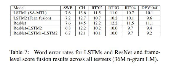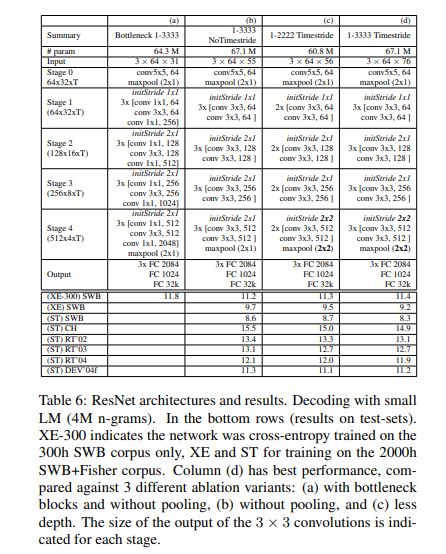 对于卷积网络声学建模,作者们训练了一套残差网络。下表所示为几种 ResNet 架构及其在测试数据上的实际性能。