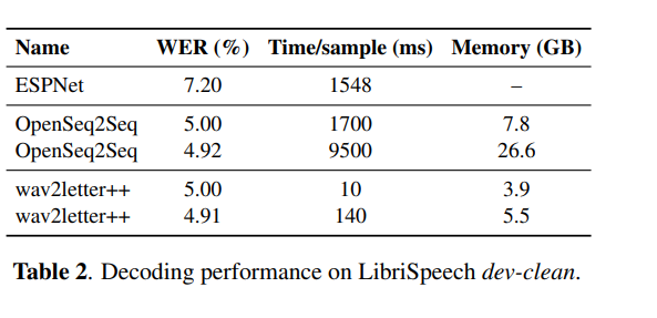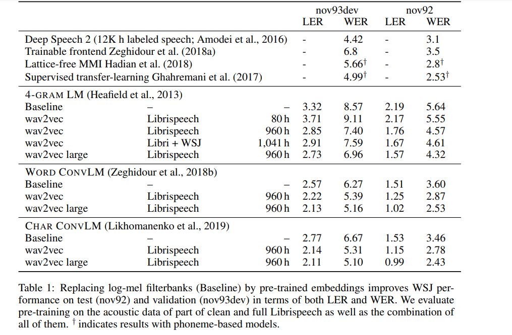编码器与上下文网络中的各层包括具有 512 个信道的因果卷积层,一个组归一化层以及一项 ReLU 非线性激活函数。在训练期间,由上下文网络生成的表示被馈送至声学模型当中。声学模型的训练与评估利用 wav2letter++ 工具包完成。在解码方面,作者们使用由 WSJ 语言建模数据集上训练得出的字典与单独的语言模型实现。