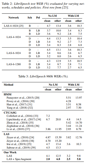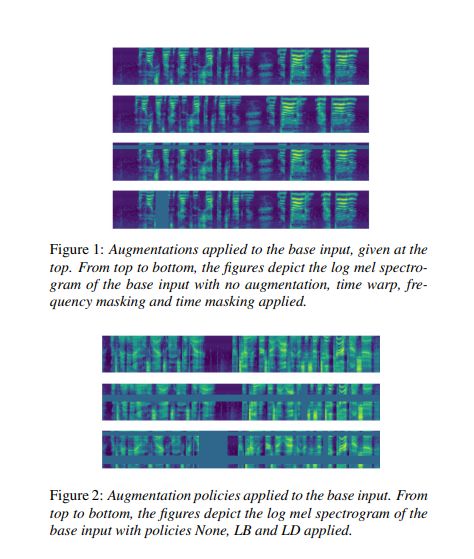 利用这种方法,作者们得以训练出一套名为 Listen, Attend and Spell (LAS) 的端到端 ASR(自动语音识别)网络。其中使用到的数据增强策略包括 time warping、frequency masking 以及 time masking 等等。