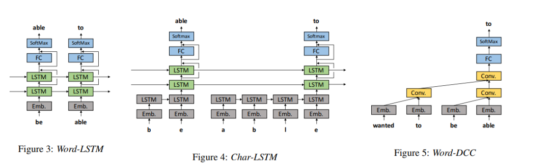 作者们还尝试了四种 LSTM 语言模型,分别为 WordLSTM、Char-LSTM、Word-LSTM-MTL 以及 Char-LSTM-MTL。下图所示为这四种模型的架构。