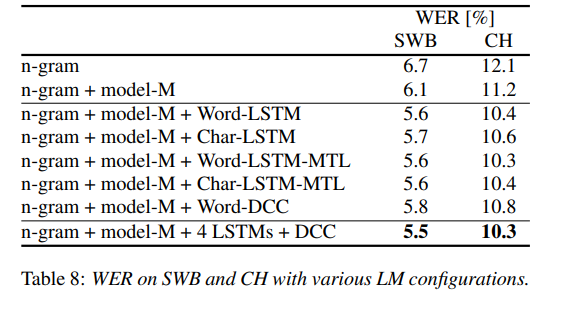 该语言模型利用字符 LSTM 与卷积 WaveNet 式语言模型。作者们的英语会话电话 LVCSR 系统在 Switchboard/CallHome 子集(SWB/CH)上分别获得了 5.5%/10.3% 的单词错误率。
